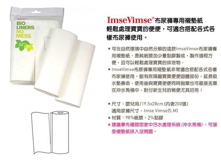 ImseVimse布尿褲專用襯墊紙非常適合搭配各式各樣布尿褲使用,能有效隔離寶寶排泄物固體部份,使用後與排泄物同時拋棄也可直接丟棄在沖水馬桶中。
