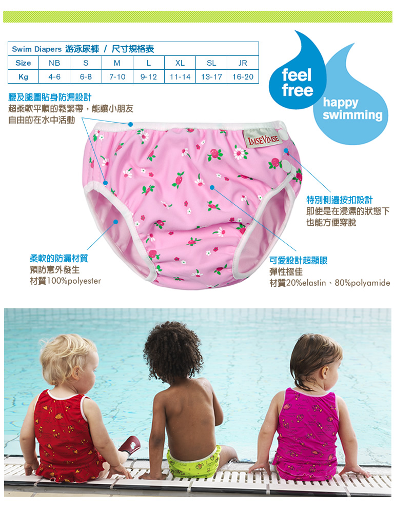 ImseVimse超彈性防漏游泳尿褲內有一層柔軟的防漏材質,可預防意外發生時,讓小朋友的便便保留在尿褲裡,不會汙染泳池;此外,腰及腿圍設計超柔軟平順的鬆緊帶,能讓小朋友自由的在水中活動;而外層泳裝材質彈性極佳,在水中穿著可以很合身、輕盈。