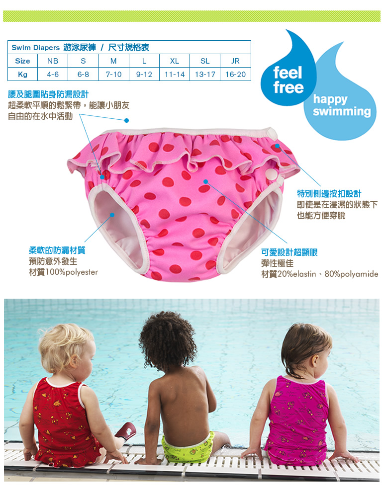 ImseVimse超彈性防漏游泳尿褲內有一層柔軟的防漏材質,可預防意外發生時,讓小朋友的便便保留在尿褲裡,不會汙染泳池;此外,腰及腿圍設計超柔軟平順的鬆緊帶,能讓小朋友自由的在水中活動;而外層泳裝材質彈性極佳,在水中穿著可以很合身、輕盈。