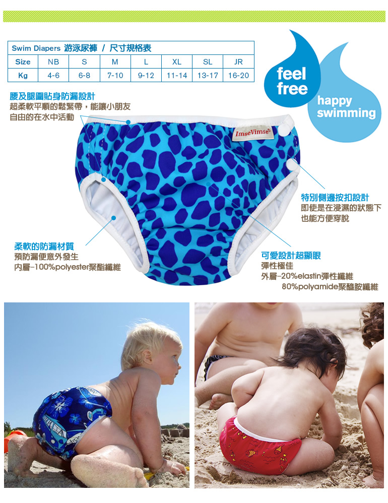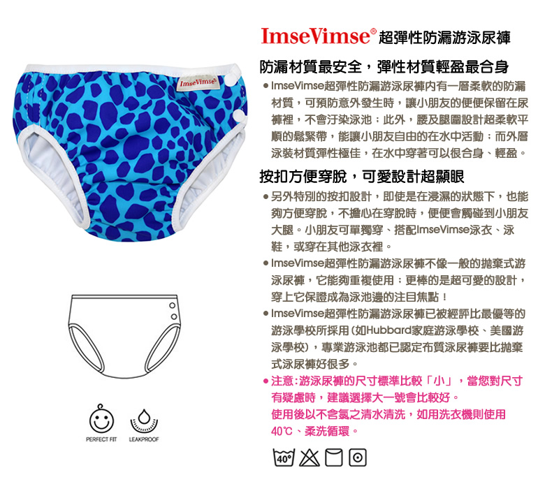 ImseVimse超彈性防漏游泳尿褲內有一層柔軟的防漏材質,可預防意外發生時,讓小朋友的便便保留在尿褲裡,不會汙染泳池;此外,腰及腿圍設計超柔軟平順的鬆緊帶,能讓小朋友自由的在水中活動;而外層泳裝材質彈性極佳,在水中穿著可以很合身、輕盈。