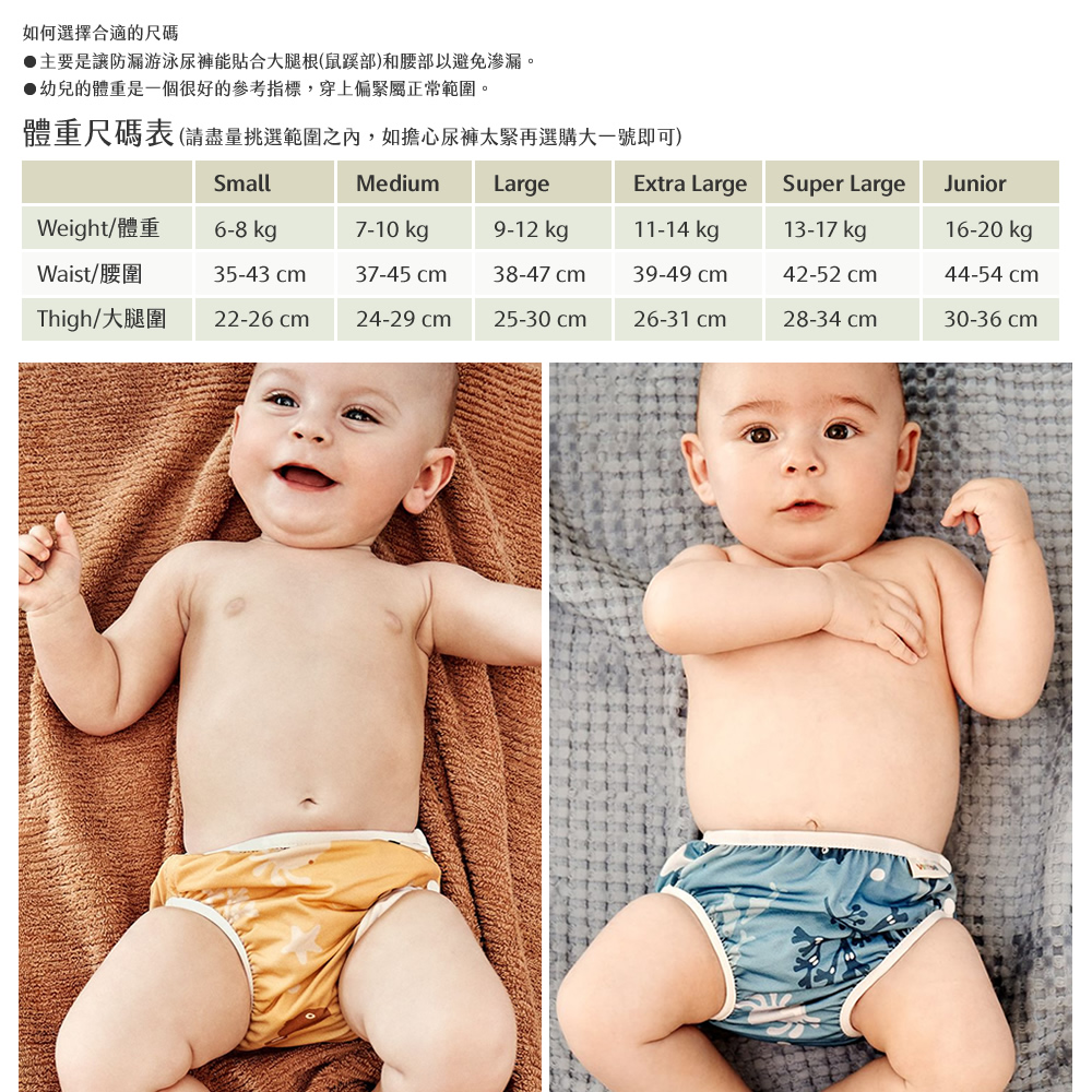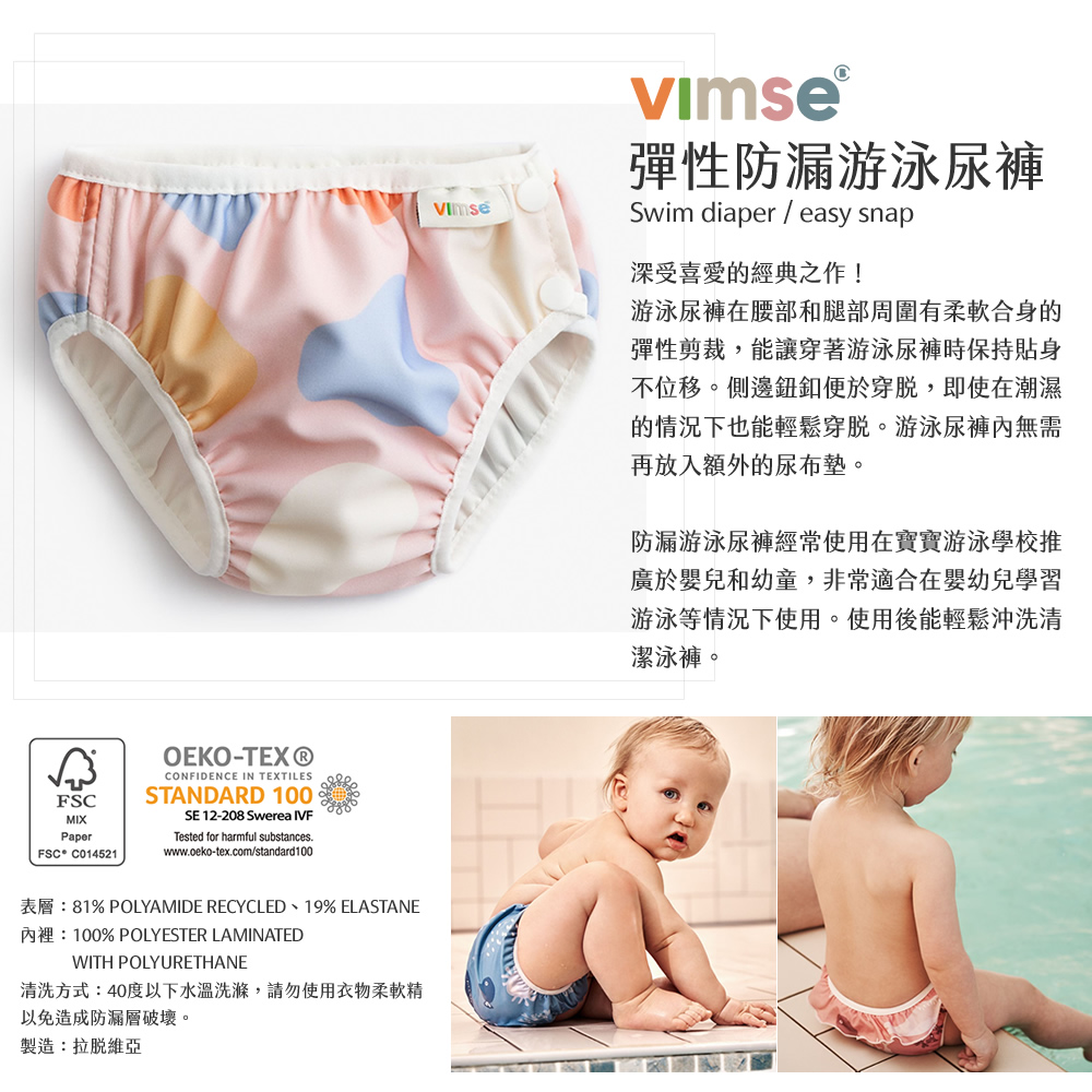 ImseVimse超彈性防漏游泳尿褲內有一層柔軟的防漏材質,可預防意外發生時,讓小朋友的便便保留在尿褲裡,不會汙染泳池;此外,腰及腿圍設計超柔軟平順的鬆緊帶,能讓小朋友自由的在水中活動;而外層泳裝材質彈性極佳,在水中穿著可以很合身、輕盈。