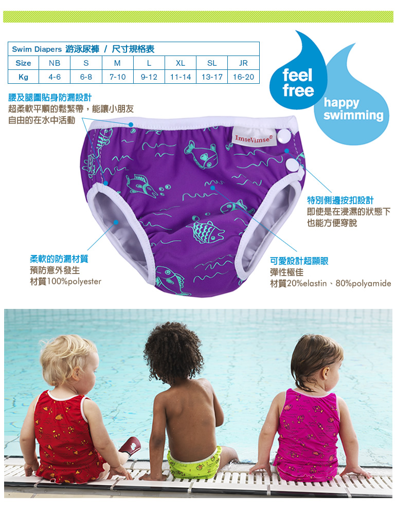 ImseVimse超彈性防漏游泳尿褲內有一層柔軟的防漏材質,可預防意外發生時,讓小朋友的便便保留在尿褲裡,不會汙染泳池;此外,腰及腿圍設計超柔軟平順的鬆緊帶,能讓小朋友自由的在水中活動;而外層泳裝材質彈性極佳,在水中穿著可以很合身、輕盈。
