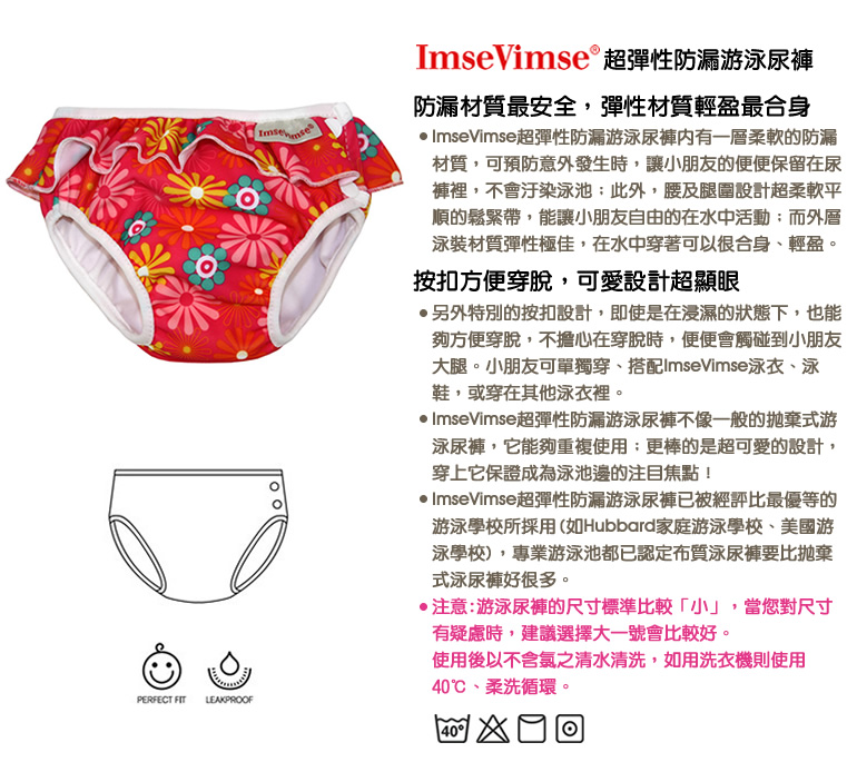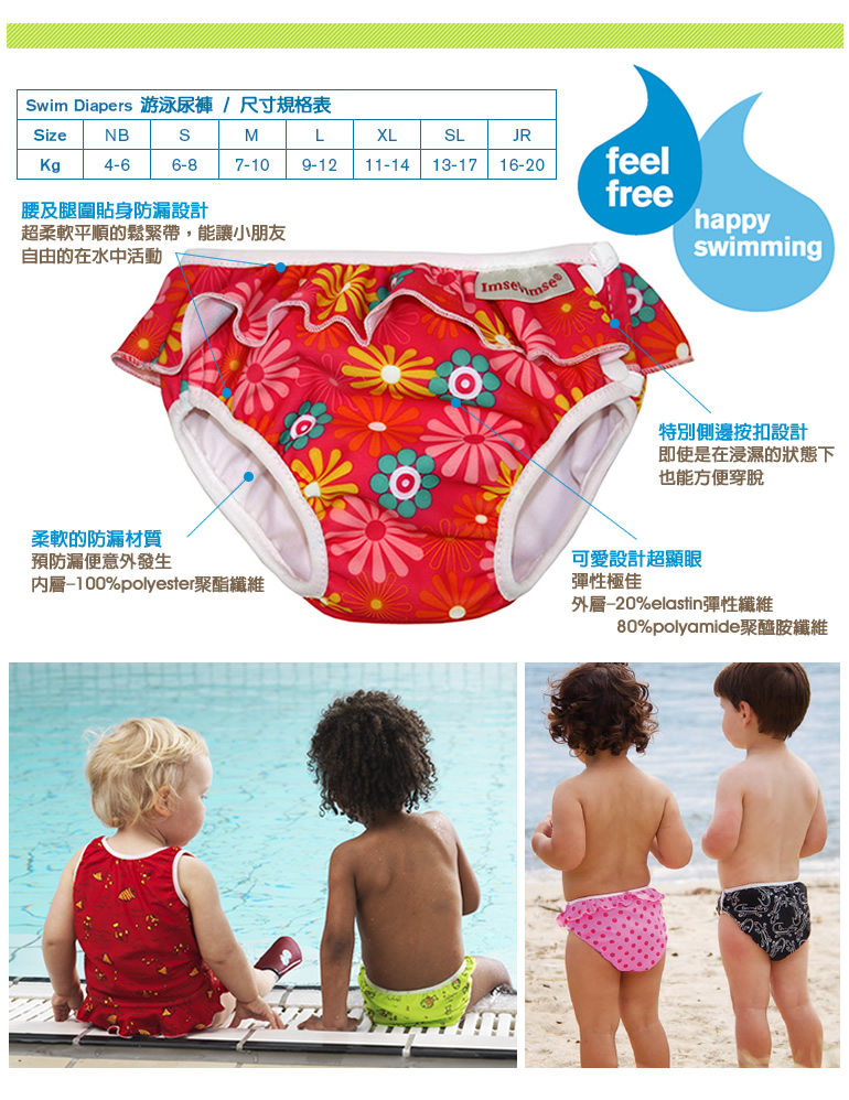 ImseVimse超彈性防漏游泳尿褲內有一層柔軟的防漏材質,可預防意外發生時,讓小朋友的便便保留在尿褲裡,不會汙染泳池;此外,腰及腿圍設計超柔軟平順的鬆緊帶,能讓小朋友自由的在水中活動;而外層泳裝材質彈性極佳,在水中穿著可以很合身、輕盈。