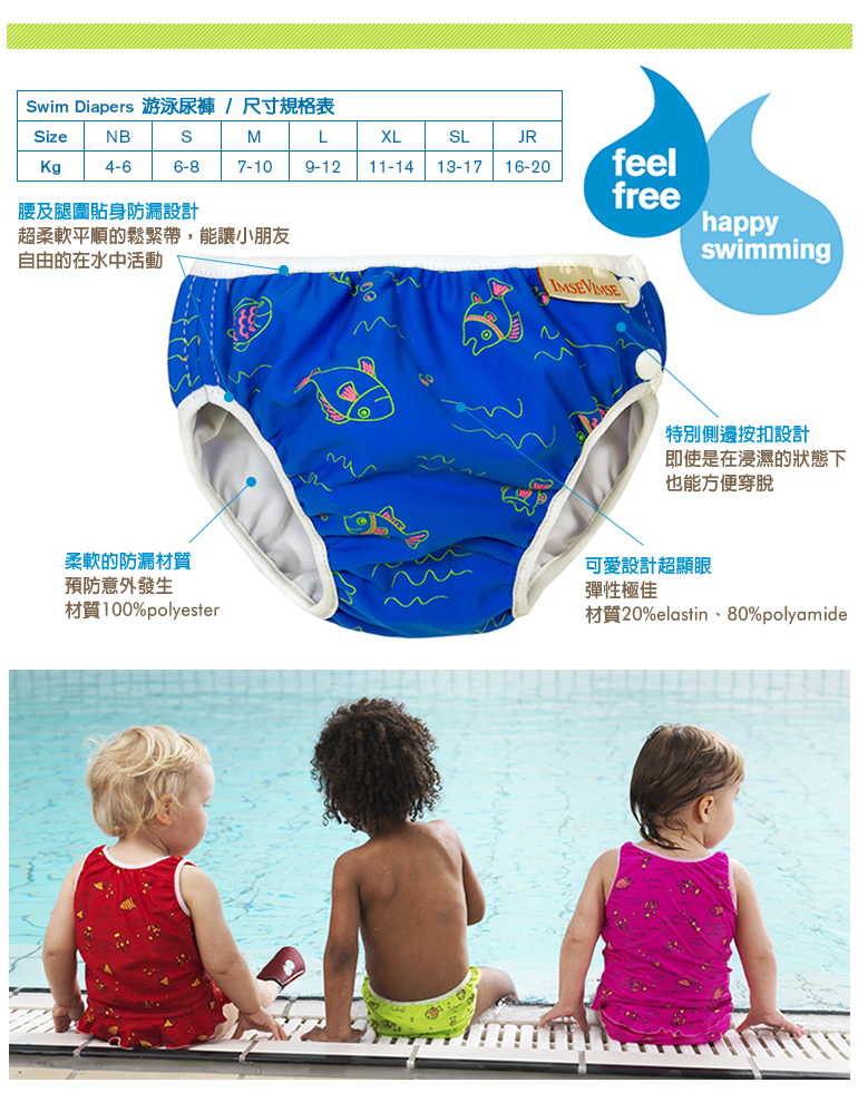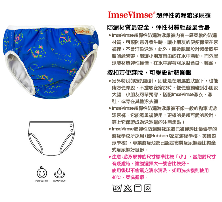ImseVimse超彈性防漏游泳尿褲內有一層柔軟的防漏材質,可預防意外發生時,讓小朋友的便便保留在尿褲裡,不會汙染泳池;此外,腰及腿圍設計超柔軟平順的鬆緊帶,能讓小朋友自由的在水中活動;而外層泳裝材質彈性極佳,在水中穿著可以很合身、輕盈。