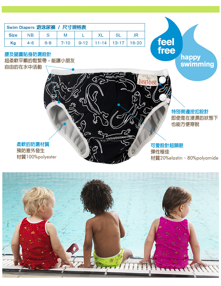 ImseVimse超彈性防漏游泳尿褲內有一層柔軟的防漏材質,可預防意外發生時,讓小朋友的便便保留在尿褲裡,不會汙染泳池;此外,腰及腿圍設計超柔軟平順的鬆緊帶,能讓小朋友自由的在水中活動;而外層泳裝材質彈性極佳,在水中穿著可以很合身、輕盈。