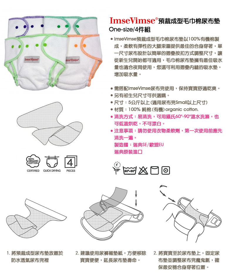 瑞典ImseVimse預裁成型毛巾尿布墊(One-size 4件組)