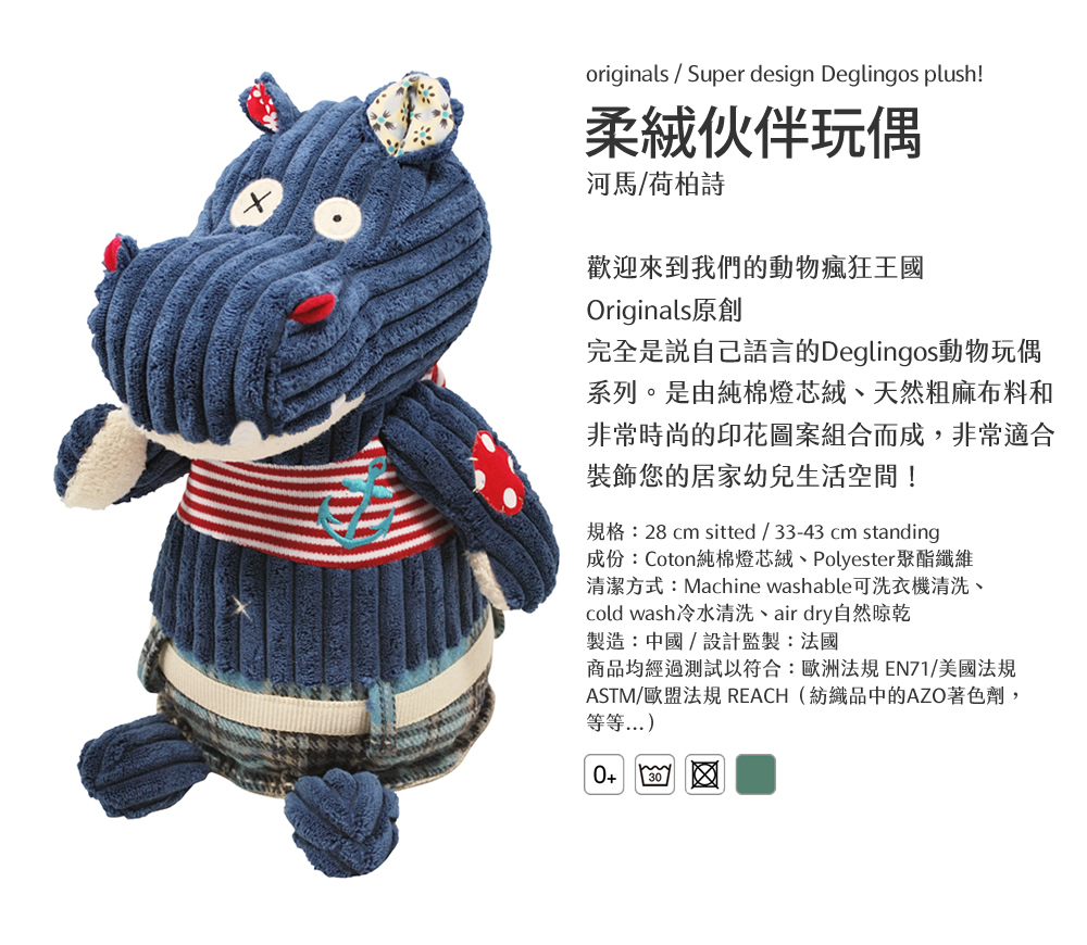 法國Les Deglingos-柔絨伙伴玩偶(河馬/荷柏詩)