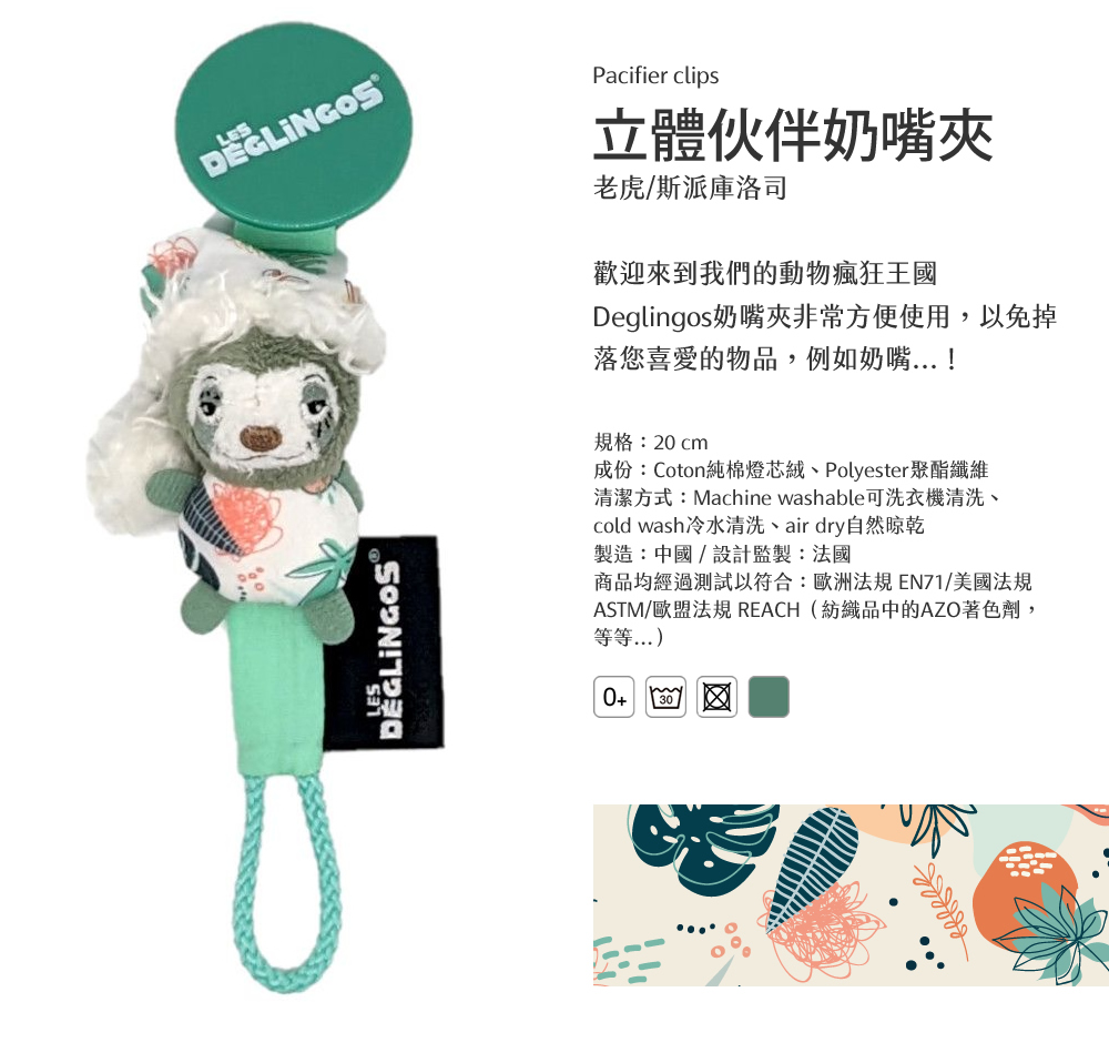 法國Les Deglingos-立體伙伴奶嘴夾(樹懶/奇洛斯)