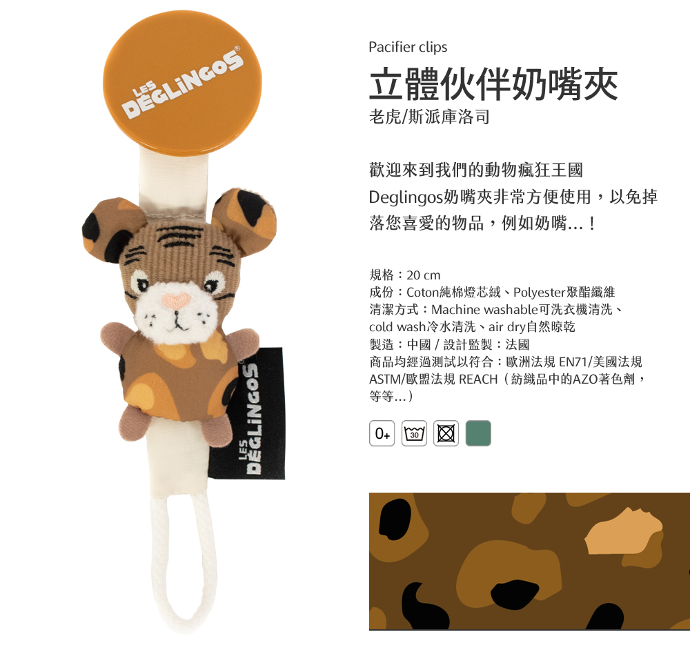 法國Les Deglingos-立體伙伴奶嘴夾(老虎/斯派庫洛司)