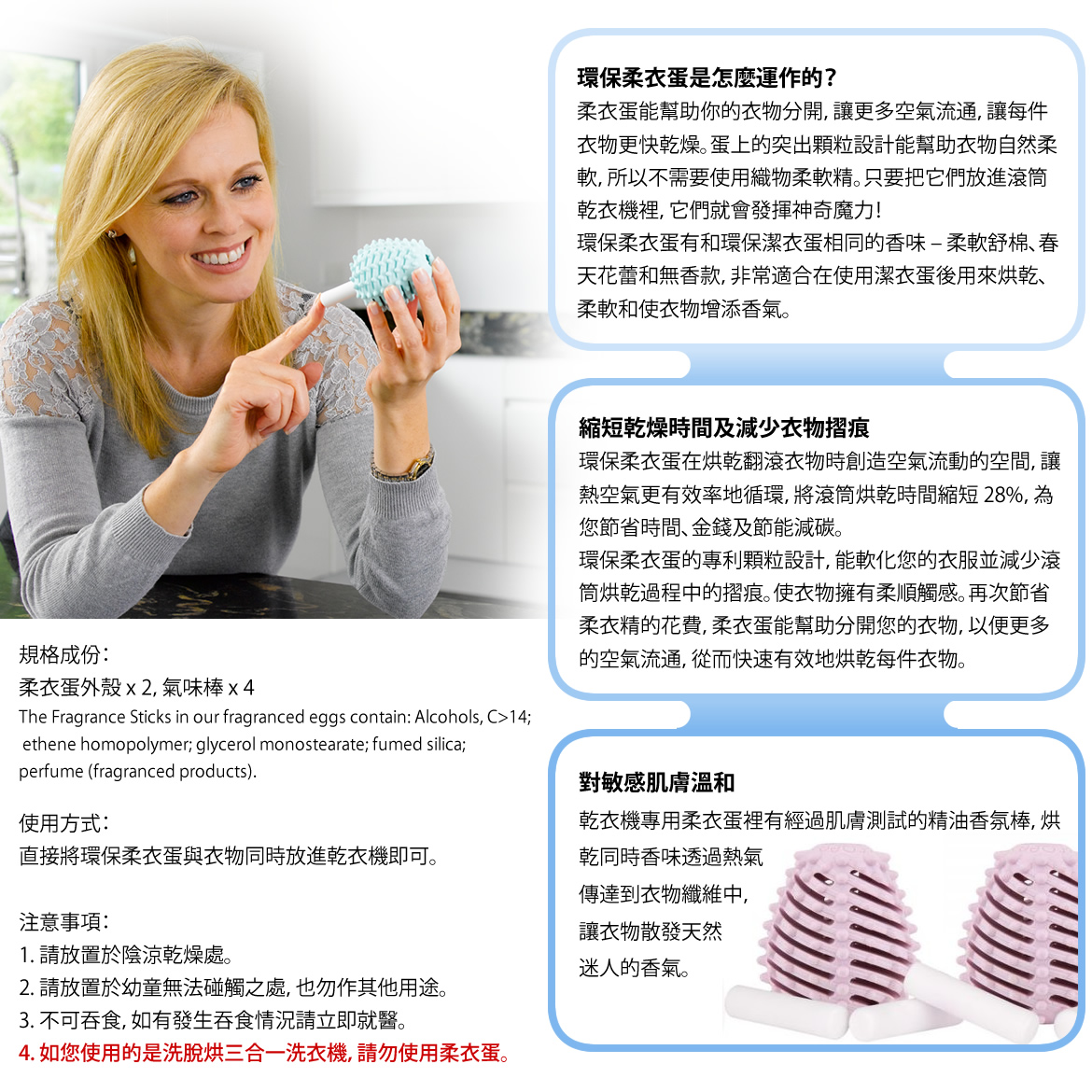 柔衣蛋是滾筒式乾衣機的最佳幫手,幫助您節省烘衣時間、精力。充滿活力的柔衣蛋喜歡在烘衣機裡跳舞~只需將兩個柔衣蛋放入滾筒式乾衣機中與您的衣物一起使用,就能加快衣物乾燥時間,減少衣物皺褶及提升柔軟度,並增加衣物的香氛效果。