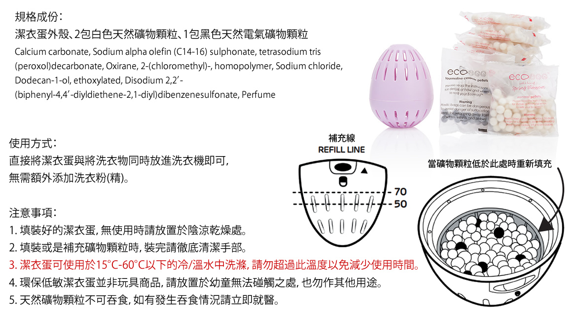 使用方式:直接將潔衣蛋與將洗衣物同時放進洗衣機即可,無需額外添加洗衣粉(精)。